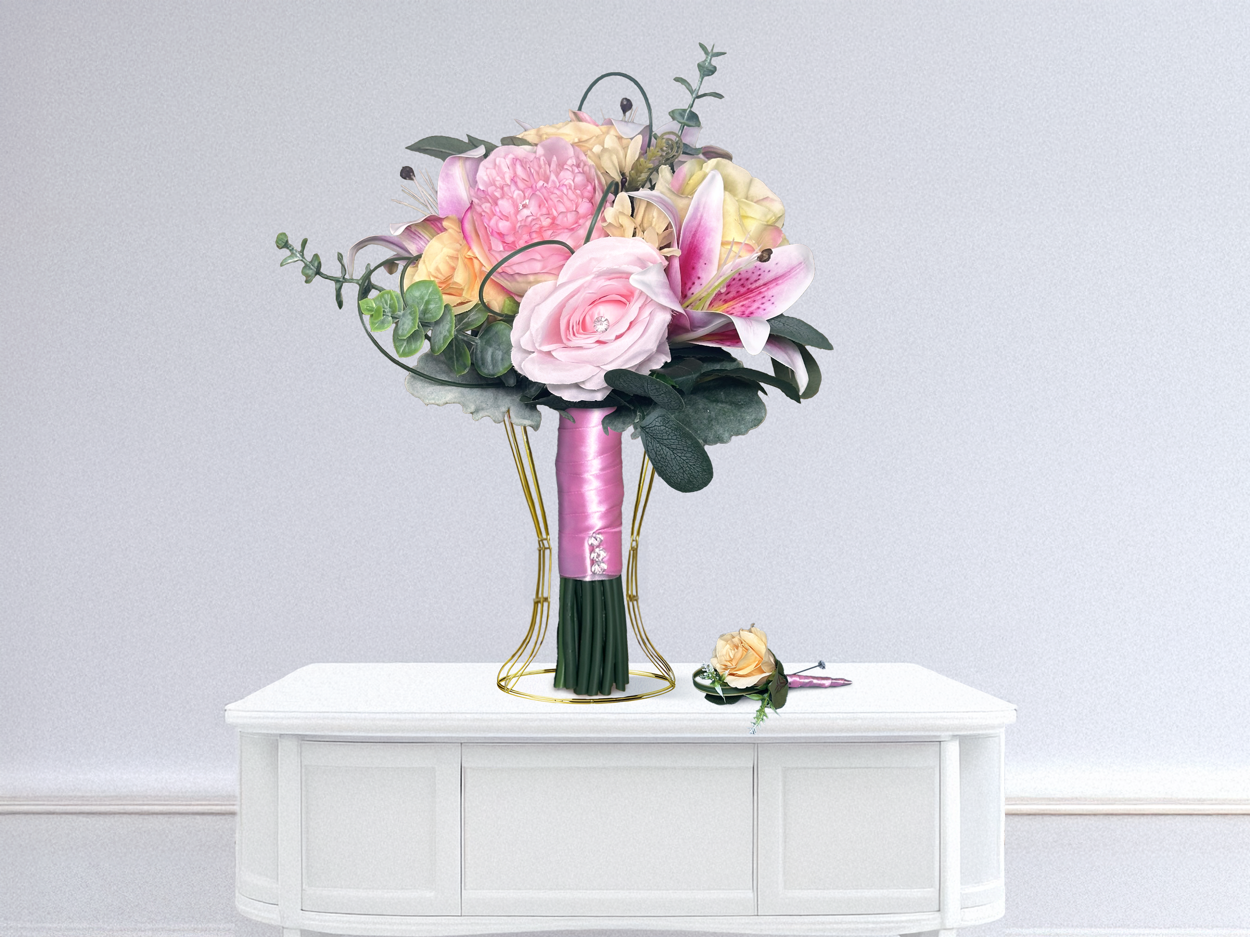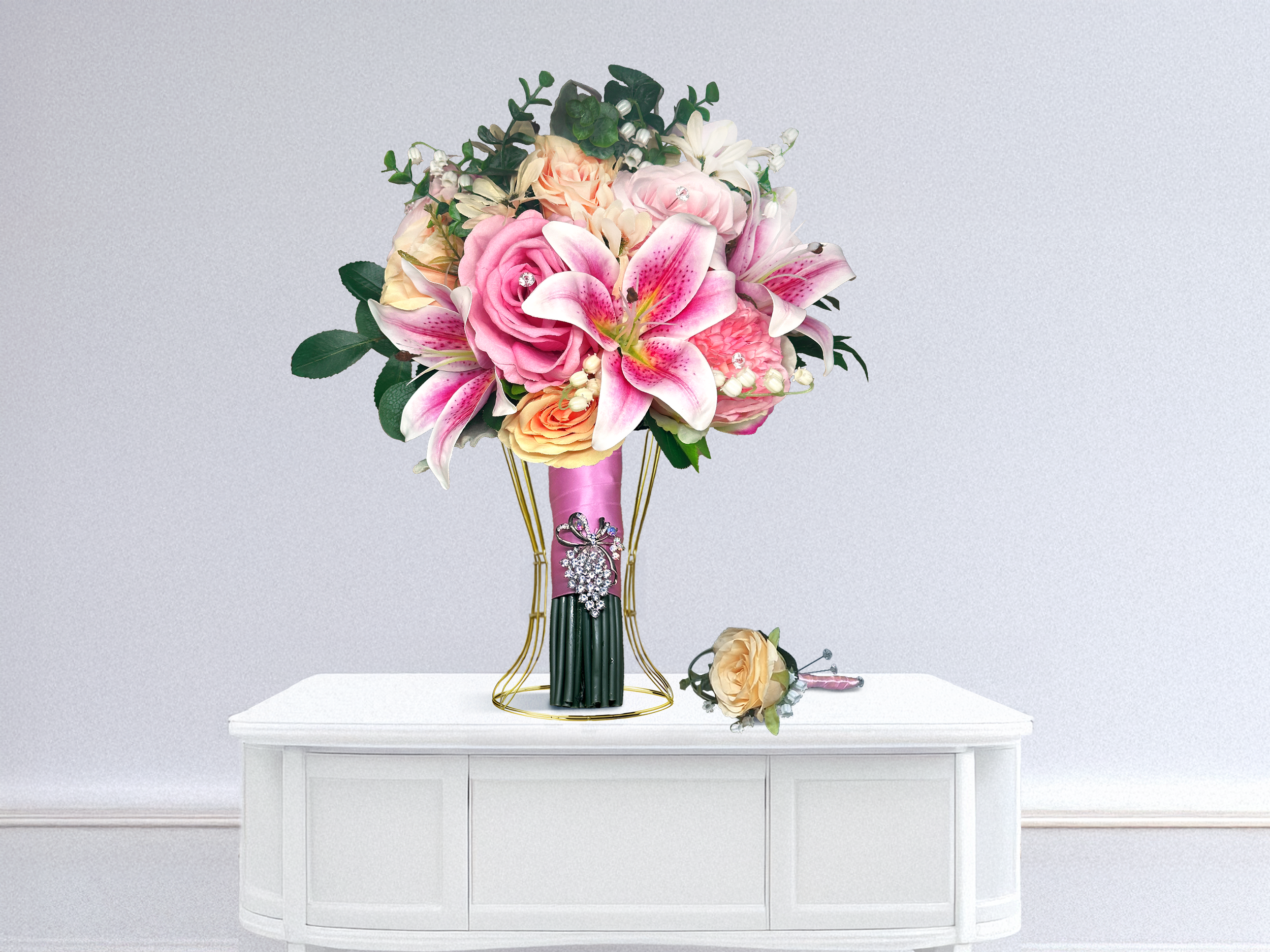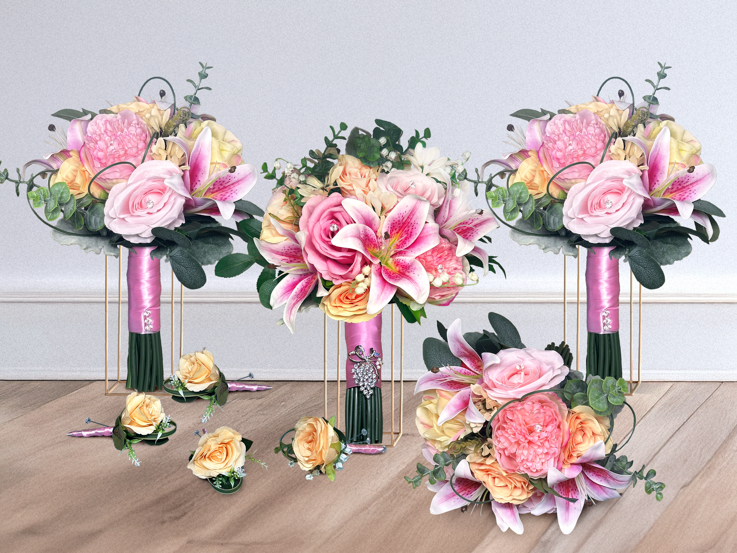 Every bloom in this collection is designed to capture romance and elegance. The mix of Stargazer lilies, soft pink peonies, champagne roses, soft pink roses, and delicate greenery creates a vibrant yet harmonious color palette, while sparkling accents and soft pink satin ribbon add subtle glamour. This bouquet set beautifully enhances your wedding photos, brings cohesion to your wedding party, and serves as a lasting keepsake of your special day.